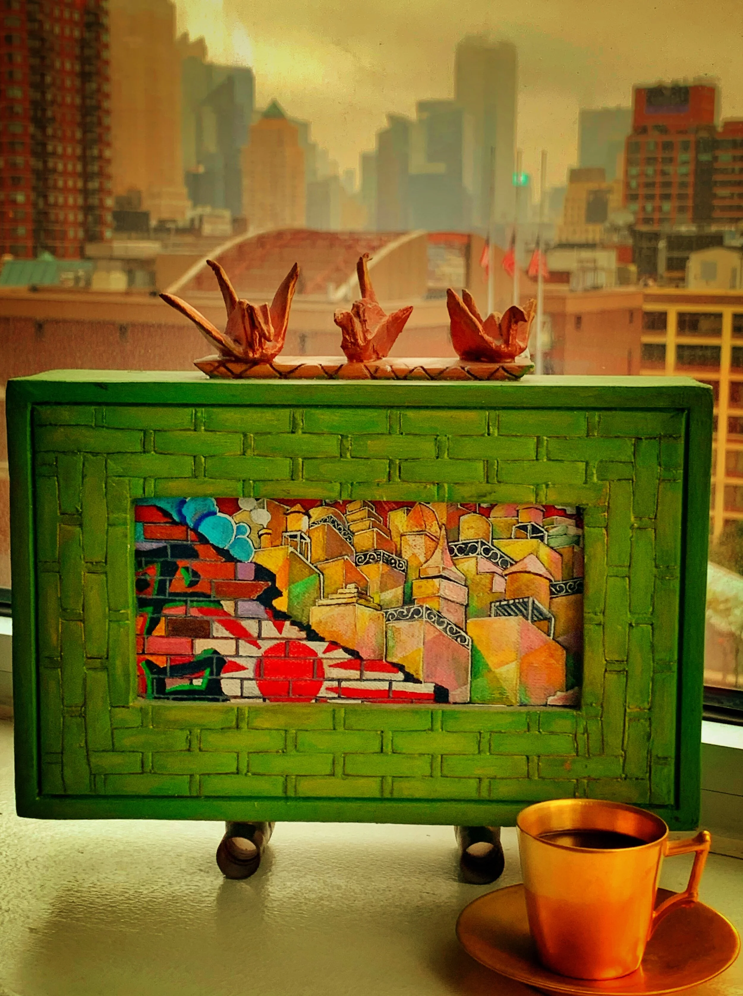 I was thinking one day how great it would be to make an interactive painting, one that gives the viewer a chance to manipulate the piece. My invention — a scroll box — contains a 6-foot by 10-inch canvas. Check out the video below to see how turning devices fashioned from copper tubing tracks the cross-country migration of a flock of origami cranes.